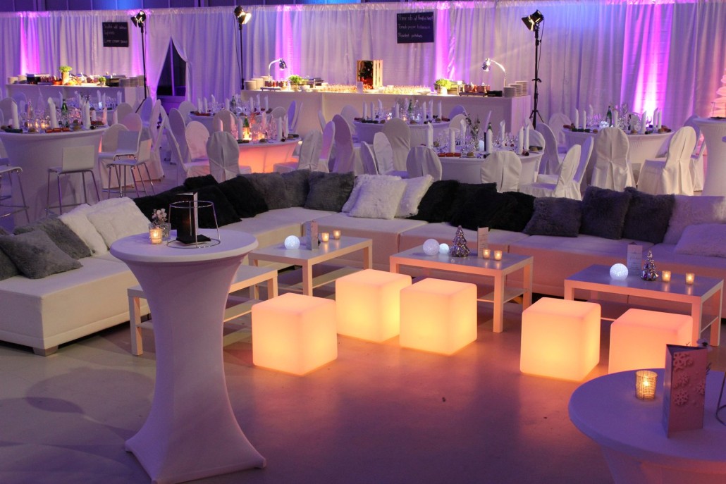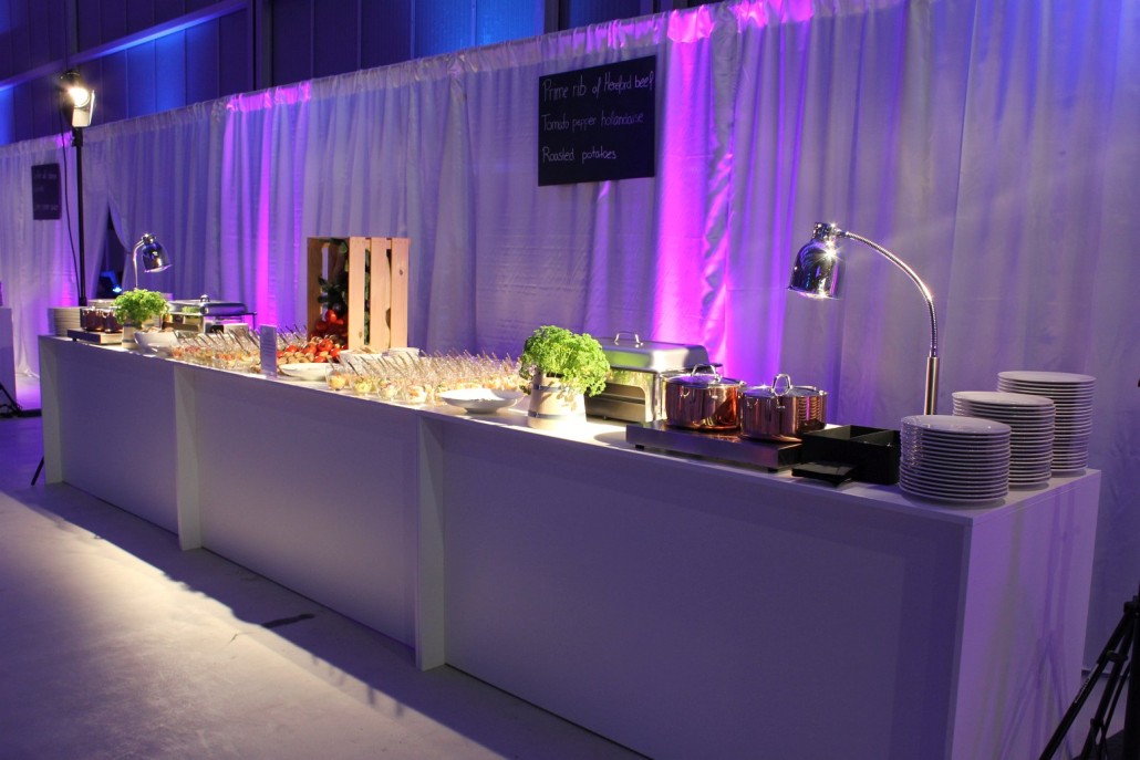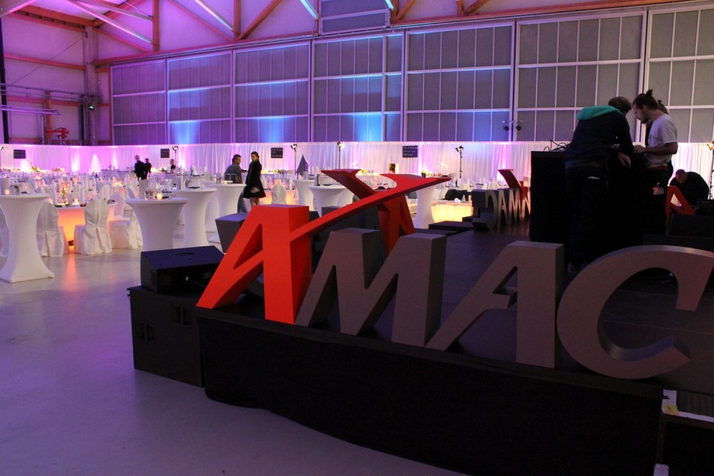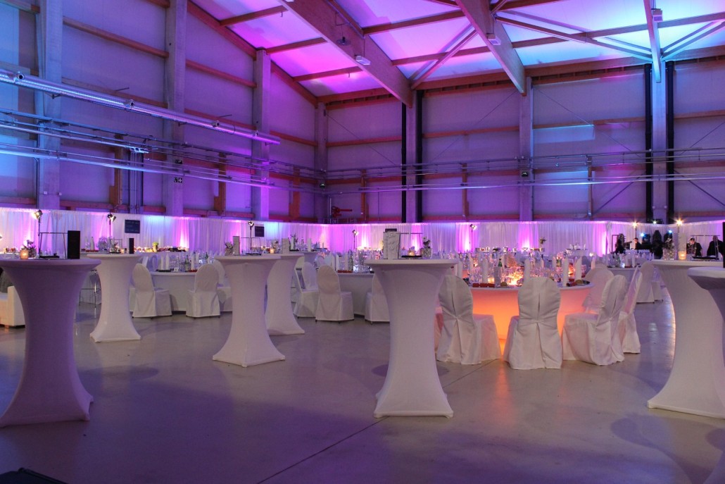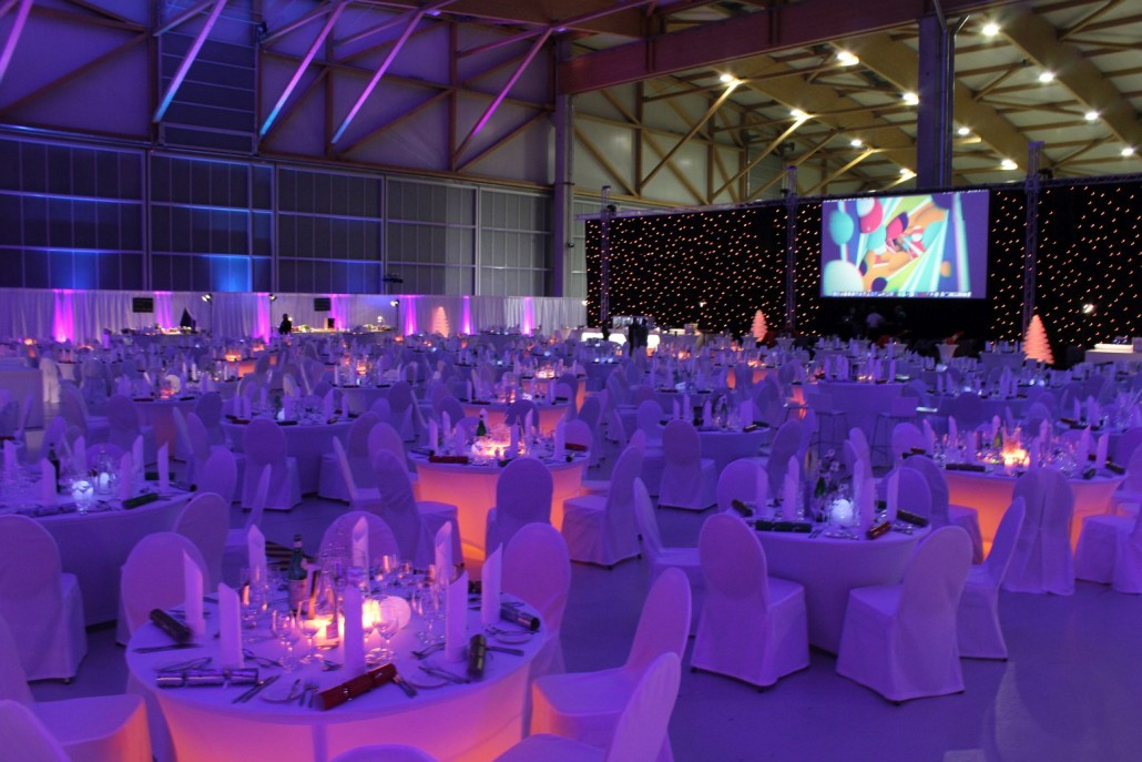 Auch 2015 durften wir wieder den Hangar 1 einer Flugzeugveredelungsfirma aus Basel am Euro Airport festlich für die Weihnachtsfeier ausstatten. Neuerungen in diesem Jahr waren der LED Star Sky hinter der Bühne, die neuen Buffettheken sowie die LED Chrismy Designobjekte.